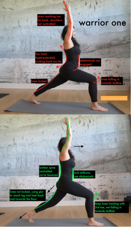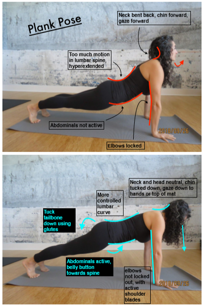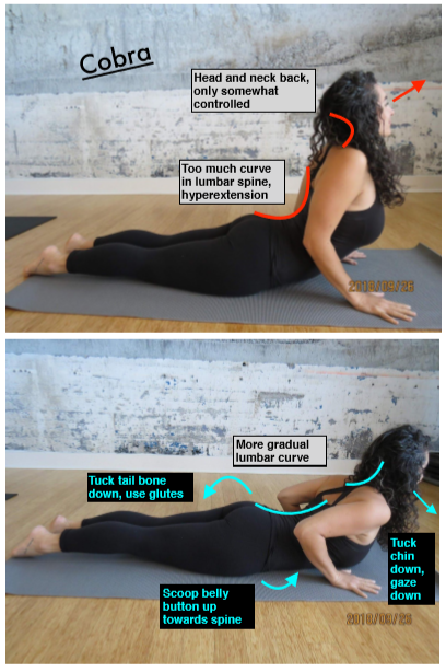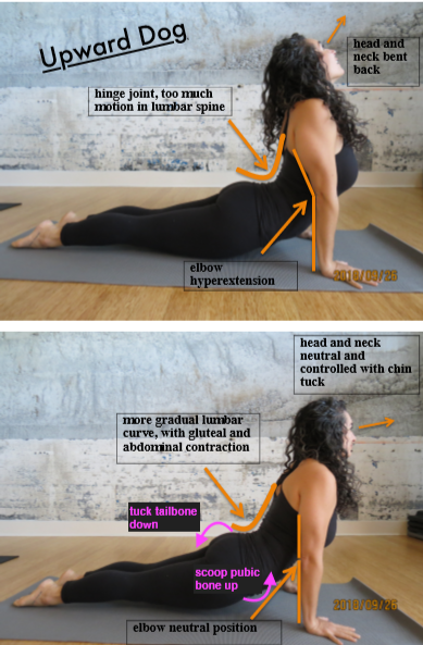 | How to control: · Lumbar hyperextension: tuck tail bone down towards the ground using gluts and bring pubic bone tucked up using lower abs · Don’t lock out elbows, keep elbows ‘soft’, use muscles around shoulders and shoulder blades. · Control head and neck posture, try to keep chin down towards throat more, gaze will not be as straight up, more towards hands or top of mat.